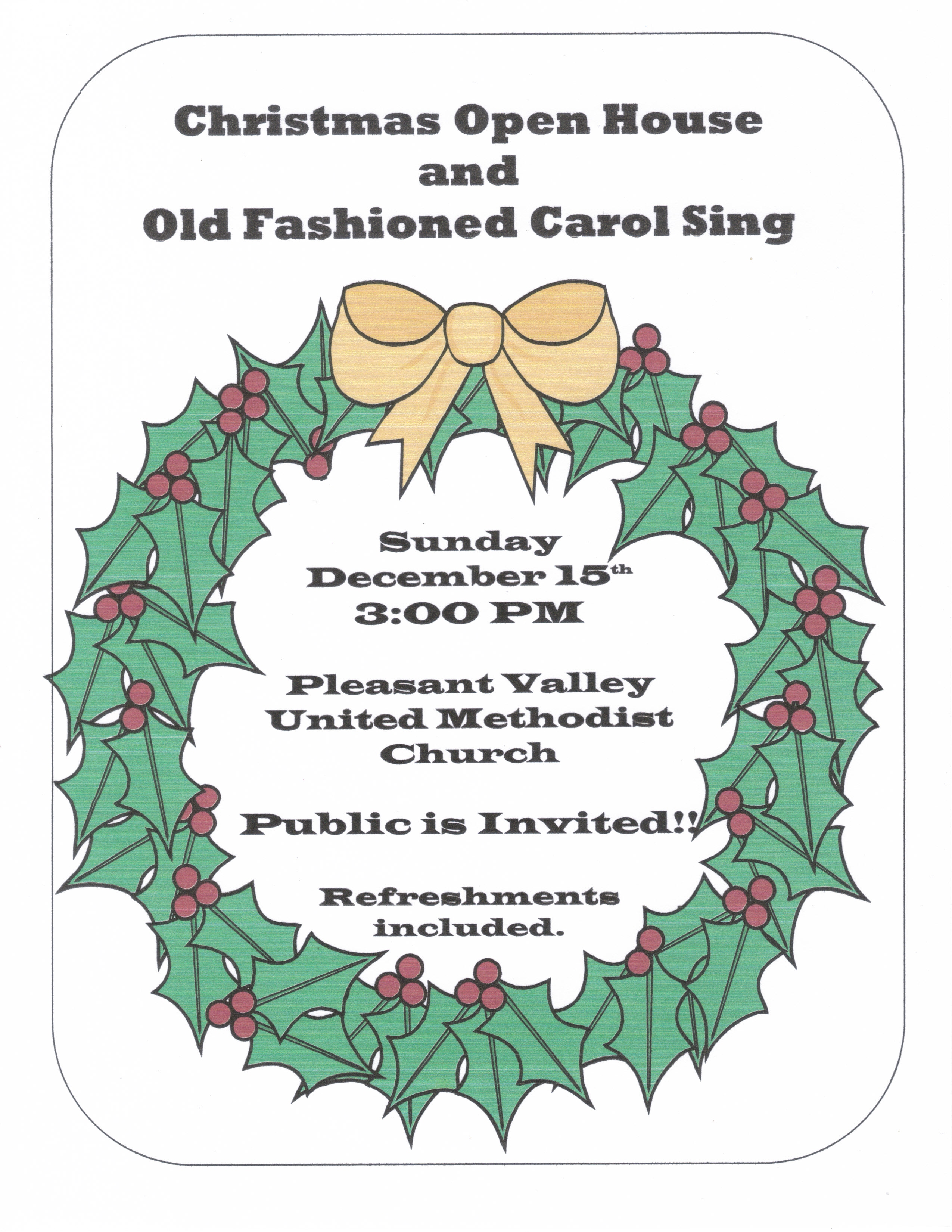 Everyone is invited to join us at the Christmas Carol Sing and Open House on Sunday, December 15th at 3 PM. Here’s your chance to sing your favorite songs of the season…just call out a hymn number! Or you may like to share a remembrance, a poem, play a song on a musical instrument, or celebrate the joy of Christmas in some other way. Or simply come and be a part of the fellowship. There will be light refreshments following the music, so plan to stay and visit with your neighbors.