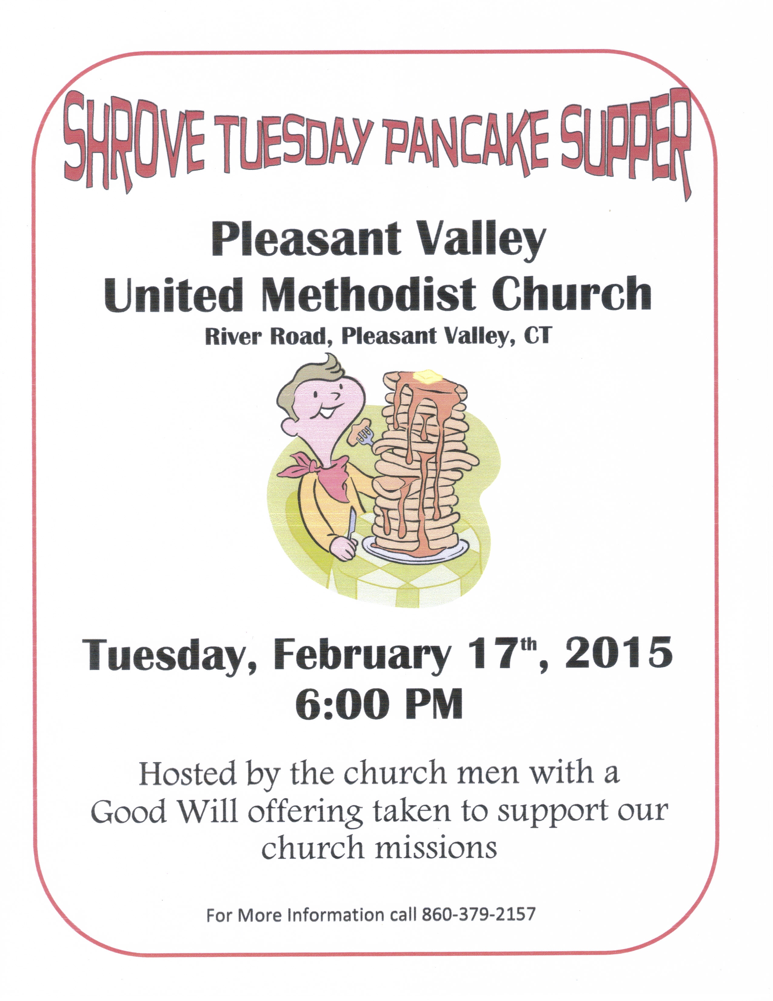 Our church men will once again be hosting the Shrove Tuesday Pancake Supper on February 17th, beginning at 6:00 pm. The menu will include pancakes, sausage, potato pancakes, and real maple syrup. This event is open to the community. A ‘good will offering’ jar will be available to accept donations should you wish to help support the missions of the church. Tell you friends and neighbors…and come have supper with us.
