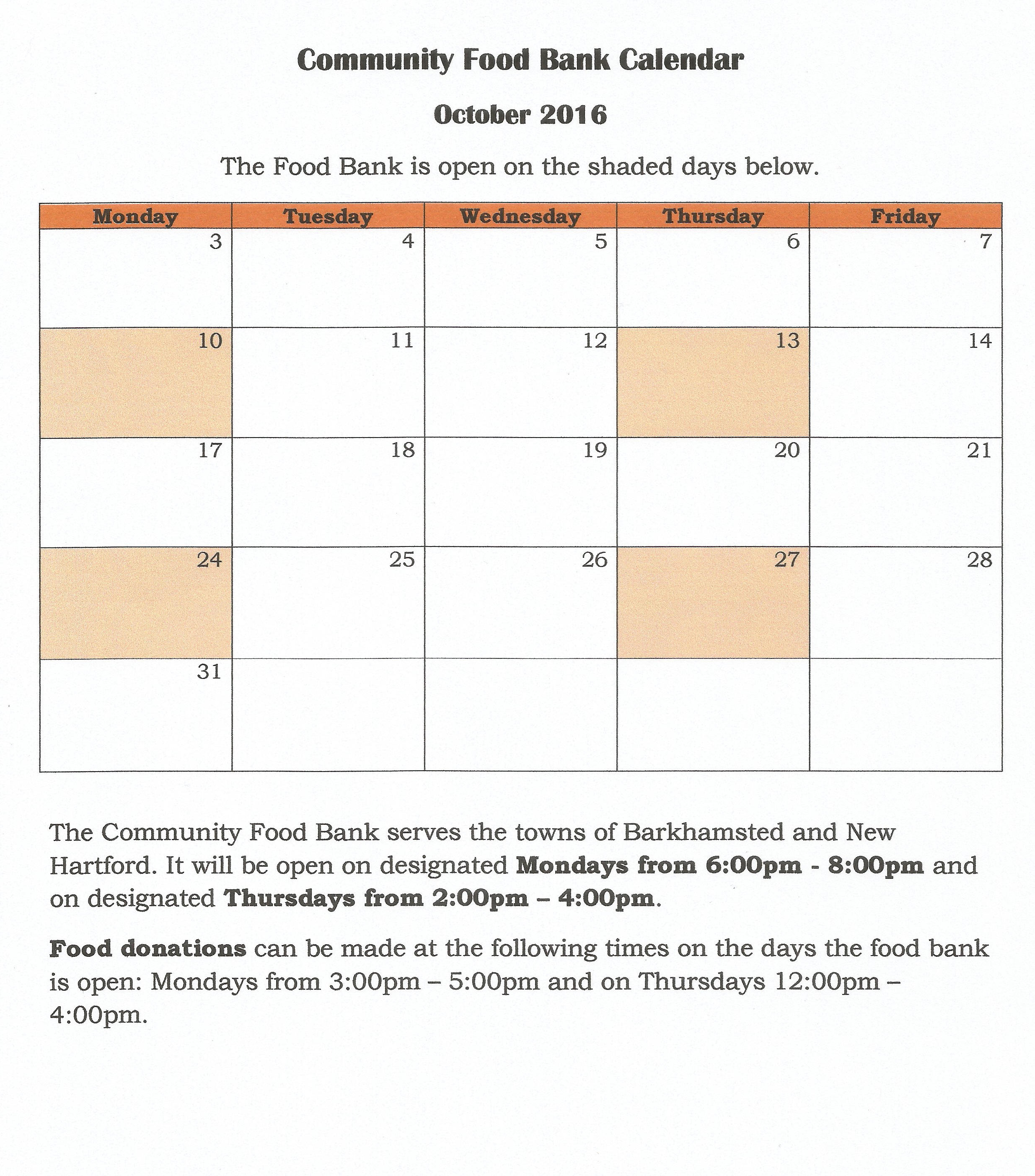 Our church houses the Community Food Bank for the towns of Barkhamsted and New Hartford. The days and times that the Food Bank is open, and the information about food donations, is listed on the calendar below. If you have any questions regarding the Food Bank, you can leave a message on our church voice mail by calling 860-379-2157 and someone will return your call.