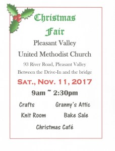 The United Methodist Women will again be hosting their annual Christmas Fair on Saturday, November 11th, from 9am to 2:30 pm. We’ll offer some lovely handcrafted items in the Craft room, beautiful handmade knit and crochet items in the Knit Room, yummy goodies at the Bake Sale, and some treasurers in Granny’s Attic. The Christmas Cafe will be open for business and you’re invited to shop and then enjoy a hearty, homemade lunch. The Fair is the major fundraiser for the UMW and monies raised will be used for various mission projects locally, nationally, and internationally. It’s a great way to start your holiday shoppping!