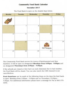 Here is the November calendar for the Community Food Bank, housed at the Pleasant Valley United Methodist Church. To see it larger, simply click on the calendar.