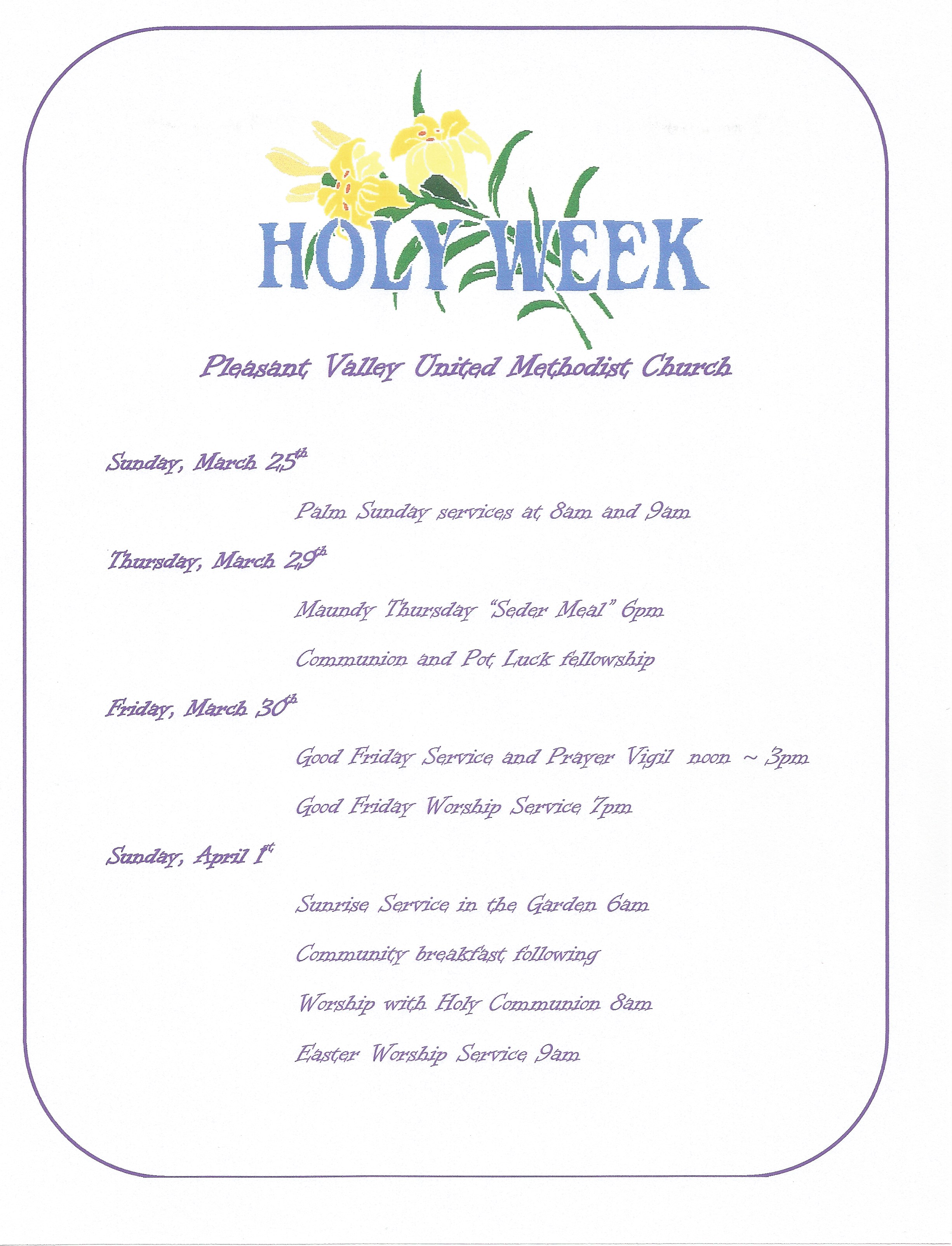 Listed below are the worship services and events happening at Pleasant Valley United Methodist Church during Holy Week, March 25th through April 1st. As you look over the opportunities for worship leading to Easter Sunday, you are most welcome to come join us in any and all of the events. Should you have any questions regarding this schedule, or about our church in general, please call the church office at 860-379-2157 and leave a message. Someone will return your call as soon as possible. In the meantime, we wish you peaceful times of reflection on the love of our Father in Heaven, and the sacrifice of His only son, Jesus Christ, and ultimately of the victory over the grave on Easter Sunday. May God send His blessings to you and your loved ones.
