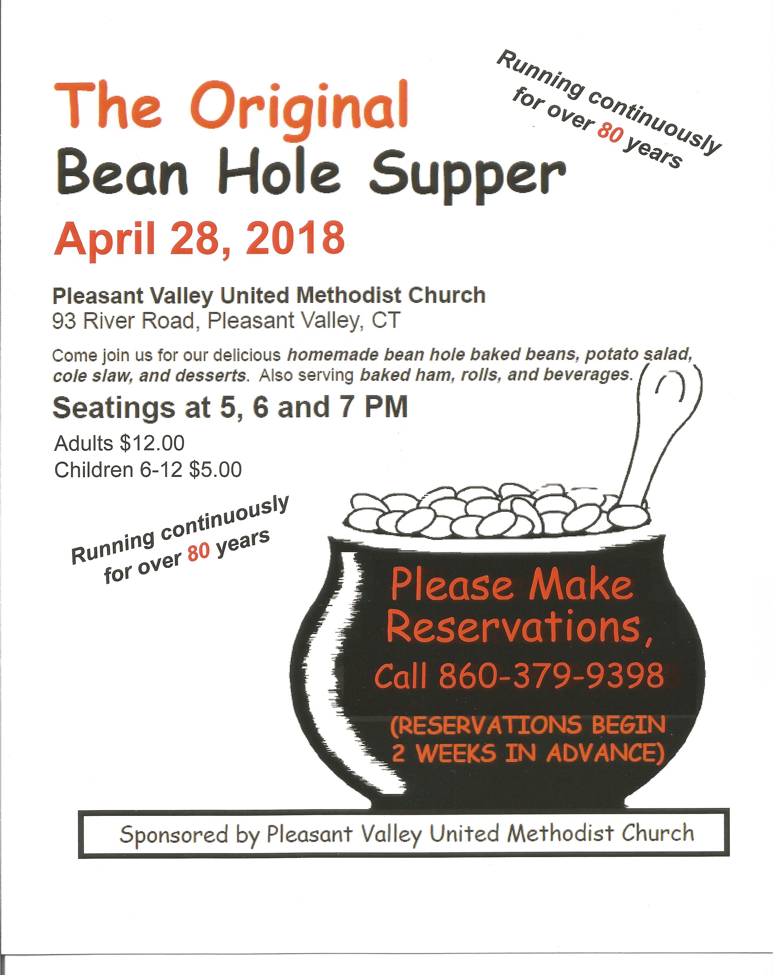 The spring Bean Hole Bean Supper will be held on Saturday, April 28th. See the flyer below for serving times, cost, and the number to call for reservations. If you’d like more information, including the history of these suppers and the menu served, click on the Bean Hole tab at the top of this page. Hope you can join us for a hearty, classic New England style meal!