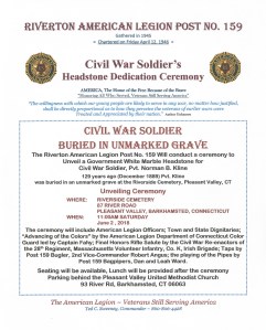 The local chapter of the American Legion has been working diligently to research and determine the identity of a Civil War veteran who is buried in an unmarked grave in Riverside Cemetery (located beside the church). On Saturday, June 2nd the group will hold a ceremony to reveal the identity of this soldier, and to share his story and the new headstone placed on his grave. The public is invited to attend. Details on the flyer below.
