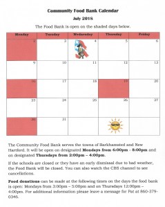 The July calendar for the Community Food Bank, located at Pleasant Valley United Methodist Church, is now available. To view it larger, simply click on the calendar.
