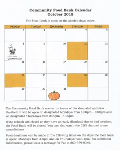 The October calendar for the Community Food Bank is shown below. As a reminder, this food bank services residents in New Hartford and Barkhamsted and is located at the Pleasant Valley United Methodist Church. To view the calendar larger, simply click on it.