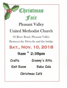 Quickly approaching is our United Methodist Women’s Annual Christmas Fair. We invite you to stop in and browse through our Granny’s Attic rooms, our handcrafted items, our hand knit & crochet room, and especially our bake sale tables. And while you’re at it, enjoy a hearty lunch in our Christmas Cafe. Details on the flyer below. Funds raised from the profits of this fair will be used to support local community needs, such as Project Graduation at Regional #7 and Gilbert Schools, Barkhamsted Cookie Jar, Community Food Bank, Greenwoods Scholarship Foundation, Susan B. Anthony Project, and Warm The Children, among others.