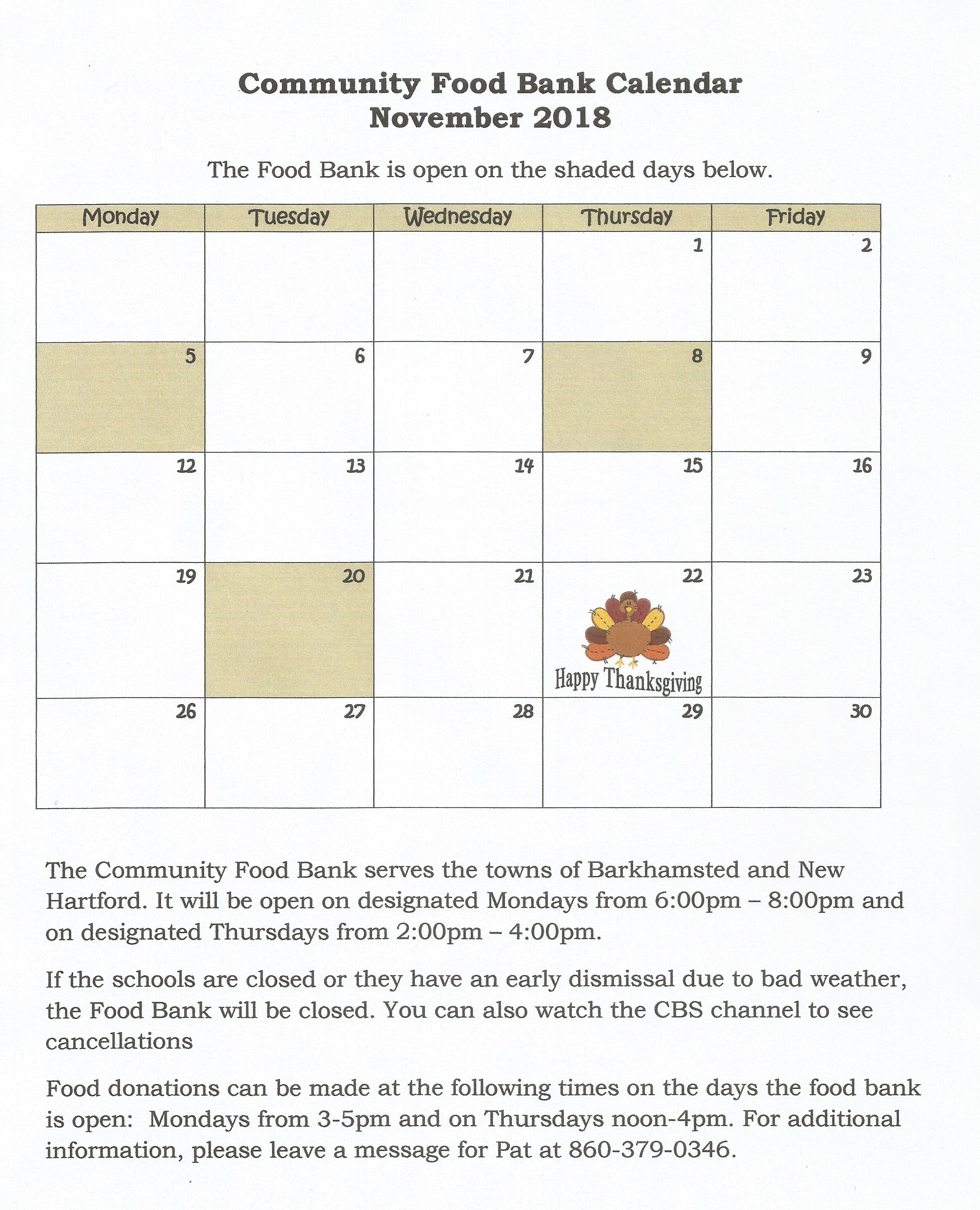 The November 2018 calendar for the Community Food Bank is now available. To view larger, just click on the calendar.