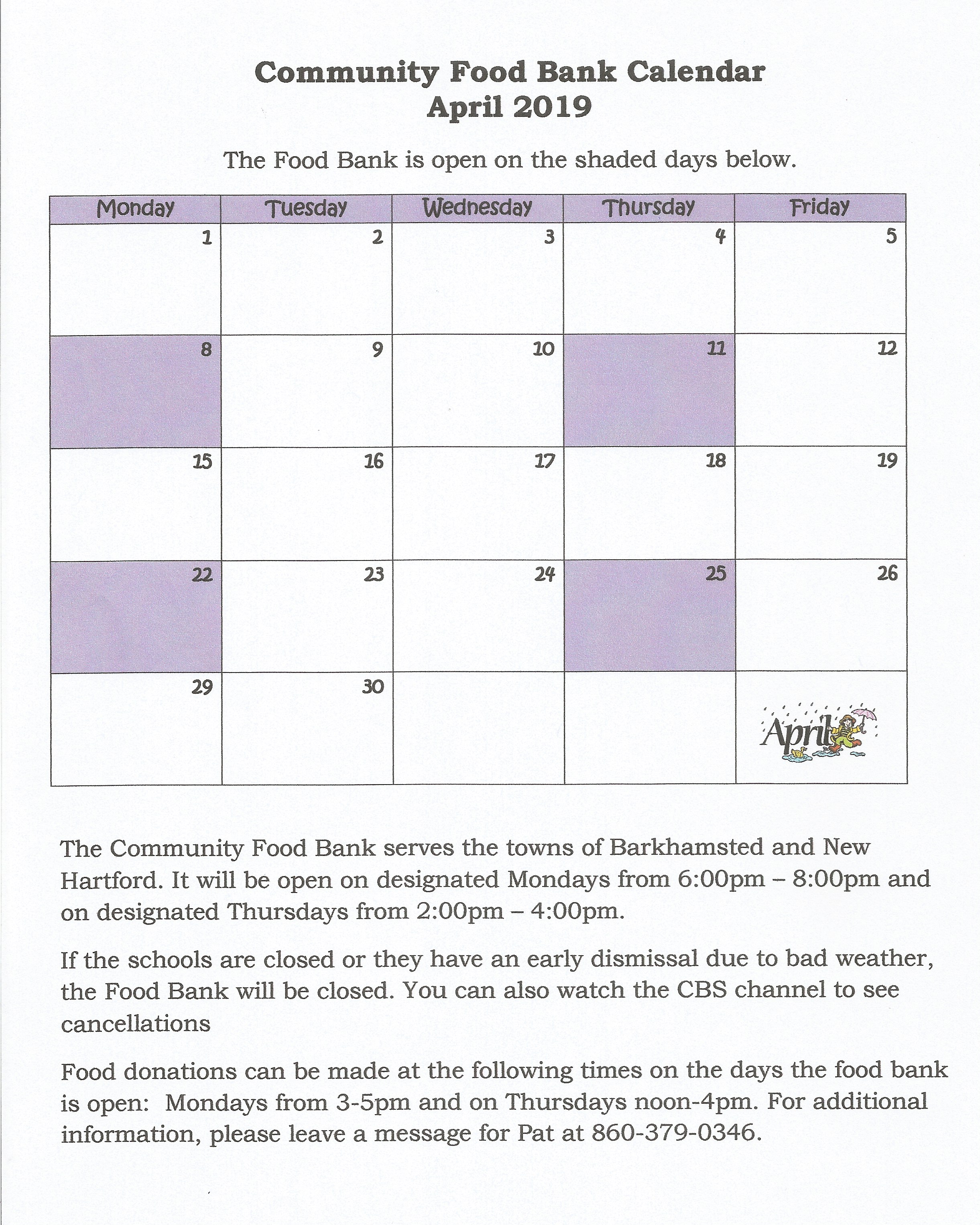The April 2019 calendar for the Community Food Bank, housed at Pleasant Valley United Methodist Church, is shown below. The Community Food Bank services the towns of Barkhamsted and New Hartford. Hours of operation are listed on the calendar.