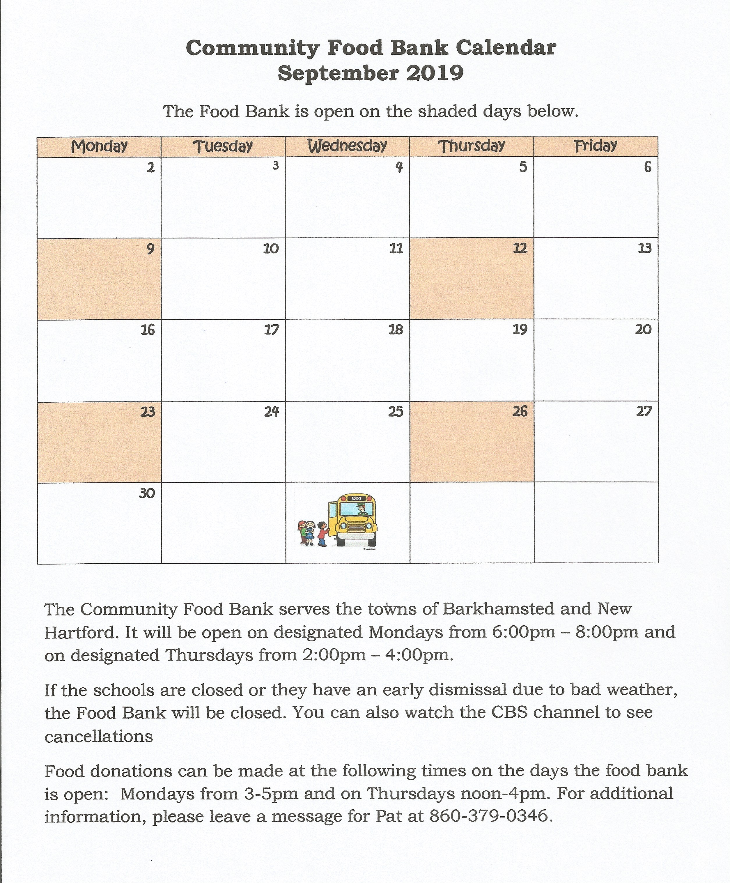 Below, you’ll find the September calendar for the Community Food Bank which is located at Pleasant Valley United Methodist Church. The Food Bank serves the towns of Barkhamsted and New Hartford. For a larger view of the calendar, simply click on the calendar. Additional information regarding times the Food Bank is open, when food can be dropped off, any cancellation information, and a phone number where you can leave a message can be found below the calendar.