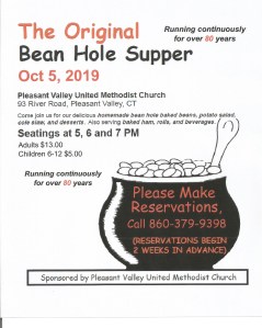 The final Bean Hole Bean Supper for 2019 will take place on Saturday, October 5th. Reservations are requested and can be made by calling the phone number on the flyer. Seating times and prices can be found there as well. If you would like more details about the suppers, including the menu and a brief description of how these suppers came about, click on the Bean Hole tab at the top of the page.