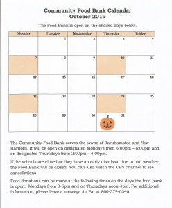 The October calendar for the Community Food Bank can be found below. The food bank assists those residents in Barkhamsted and New Hartford who need food assistance. Please note the times the food bank is open and when donations can be dropped off. To view the calendar larger, simple click on it.