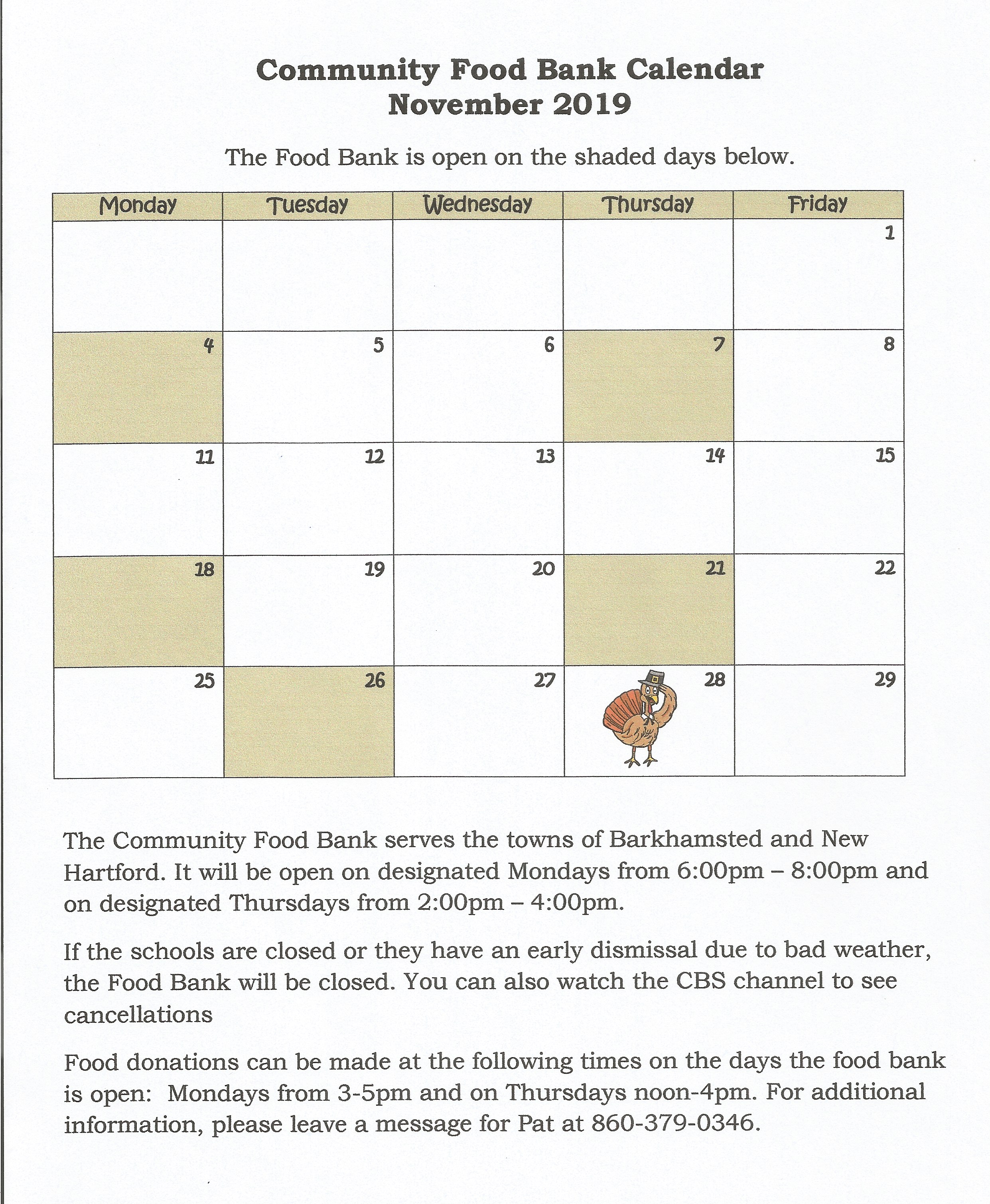 The November calendar for the Community Food Bank is shown below. The Food Bank offers food assistance for residents in Barkhamsted and New Hartford. Listed you will find the dates when the food bank is open, and when donations can be dropped off. There is also a phone number where you can leave a message to get more information. To enlarge the view, just click on the calendar.