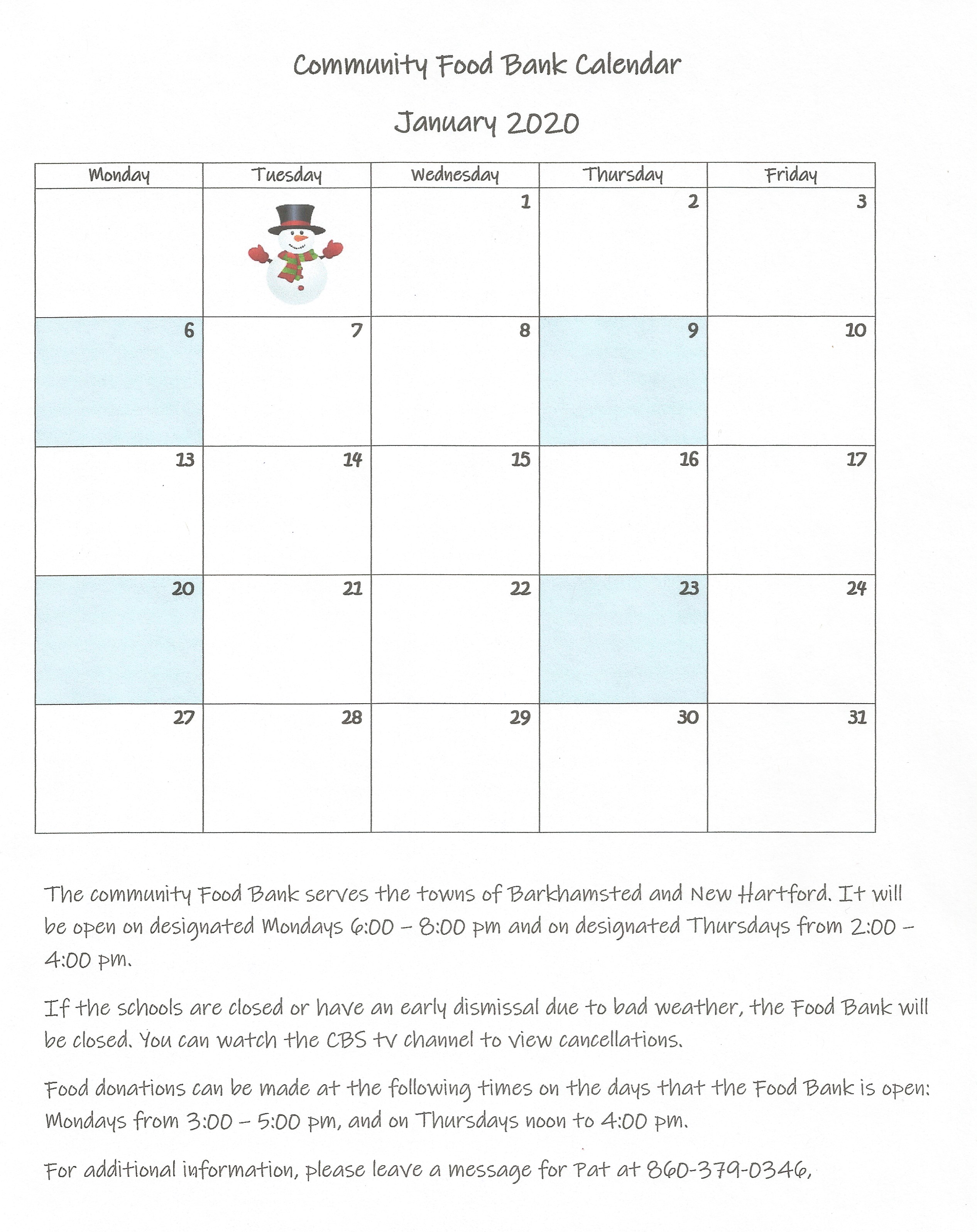Below is the January 2020 calendar for the Community Food Bank which is housed in the back of Pleasant Valley United Methodist Church. The Food Bank serves the towns of Barkhamsted and New Hartford. For a larger view of the calendar, simply click on it. For more information about the Food Bank, please call the phone number listed on the calendar page and leave a message for Pat.