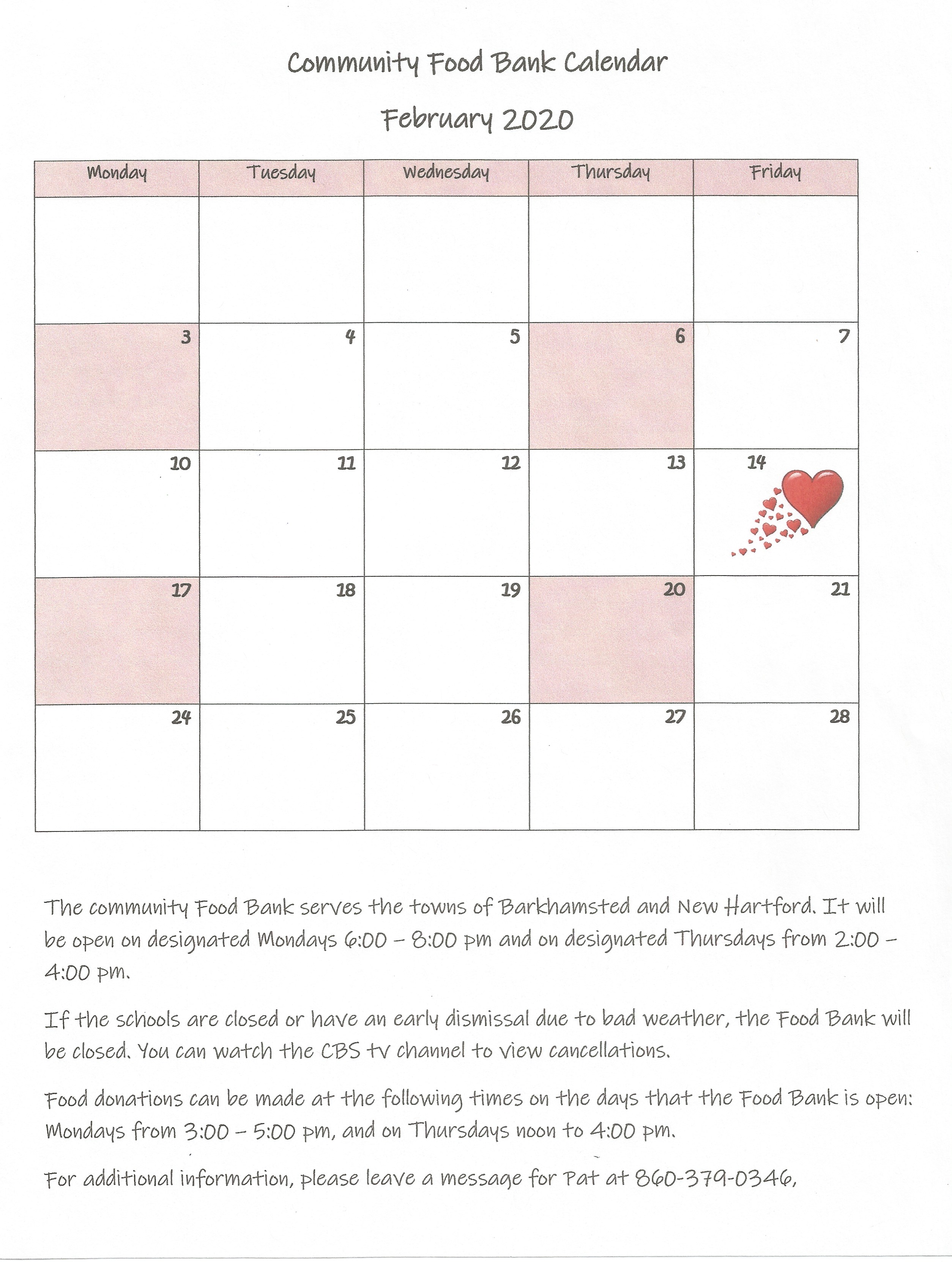 The February 2020 calendar for the Community Food Bank is shown below. To view it larger, simply click on the image.