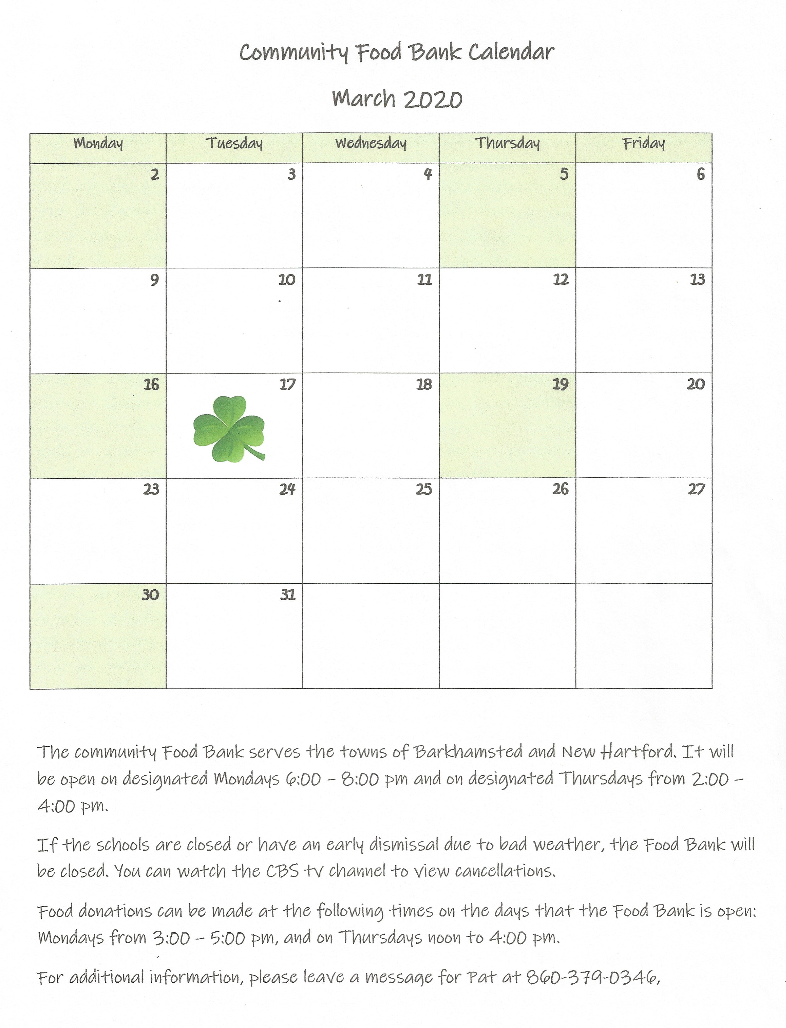 The Community Food Bank serves the towns of Barkhamsted and New Hartford and is housed at the Pleasant Valley United Methodist Church. If you have any questions or would like to schedule a donation, please call Pat at the number listed on the calendar.