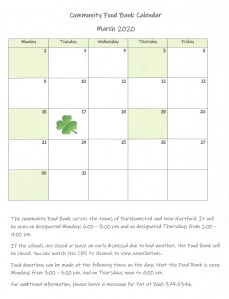 The March 2020 calendar for the Community Food Bank is shown below. To view it larger, simply click on the image.