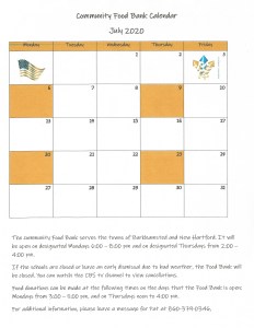 The Food Bank serves clients in Barkhamsted and New Hartford. Days the Food Bank is open are listed on the calendar, as well as times when items can be dropped off.
