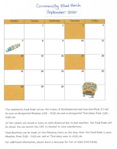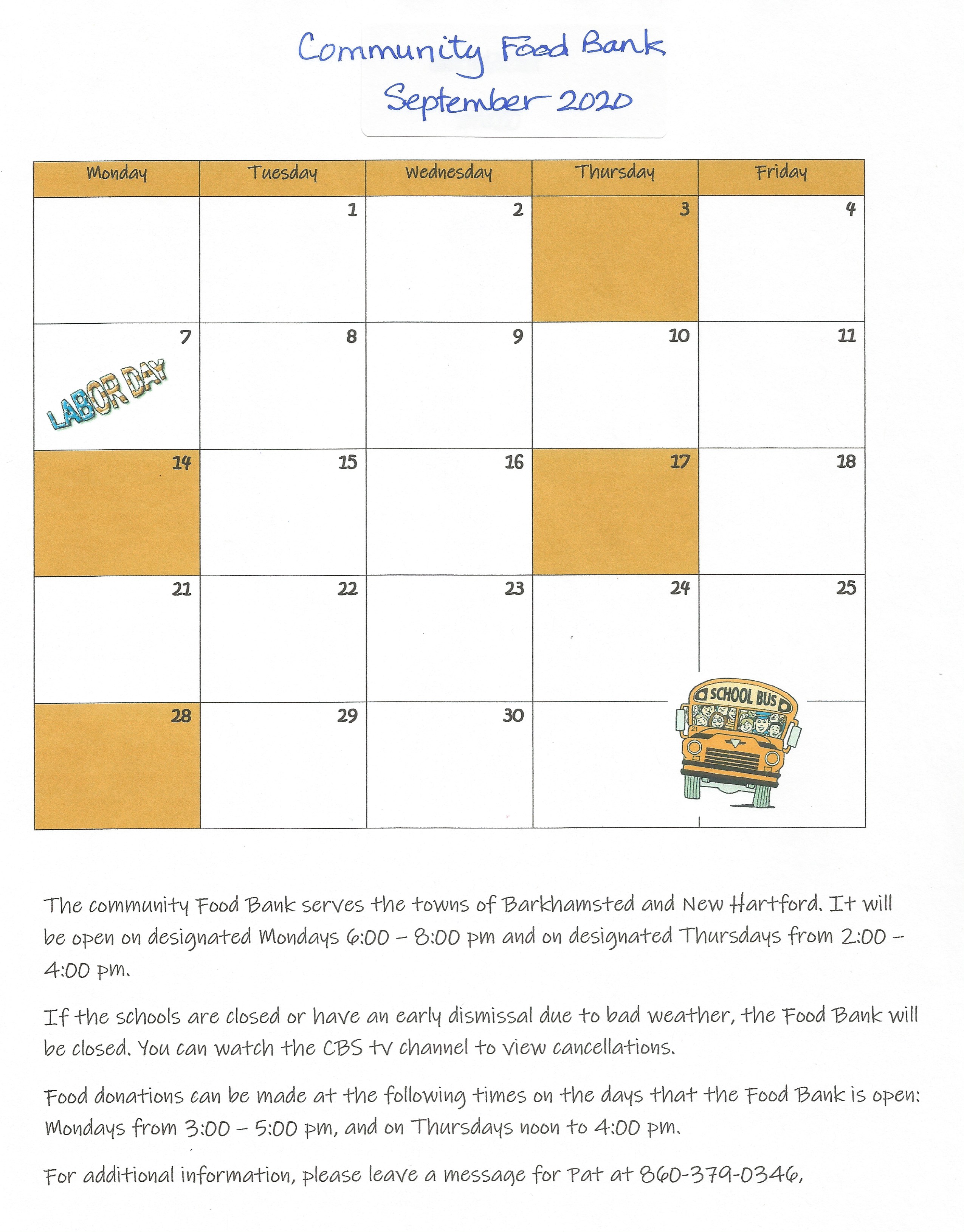 Shown below is the September 2020 calendar for the Community Food Bank, housed at the Pleasant Valley United Methodist Church. The Food Bank serves the towns of Barkhamsted and New Hartford. Due to the covid-19 issues, all clients should contact Pat to place their order which will then be available for pick-up on a table outside the building For more information, or to learn how you can make a donation, please call the phone number listed on the calendar. To view a bigger version of the calendar, simply click on the calendar.