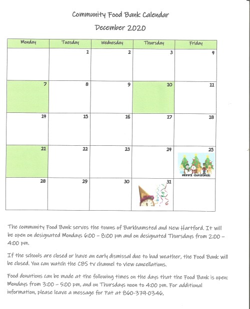 The December 2020 calendar for the Community Food Bank is shown below. To view it larger, simply click on it. The Community Food Bank serves the towns of Barkhamsted and New Hartford. Due to the covid-19 virus, orders are phoned in to the food bank staff who fill the order and bring it to a table outside the building for pick-up. If you want more information about the food bank, or to place an order, please call Pat at the number listed on the calendar.
