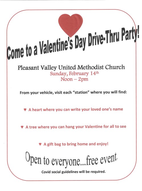 Pleasant Valley United Methodist Church invites the community to a ‘drive-thru’ Valentine’s Day event. The event runs from noon on Sunday, February 14th to 2pm. Stay in your car and drive to the various stations in our large parking lot. You will be welcomed and given some fun things at each station to remind you that love began with God, our Heavenly Father. Hope to see you there!