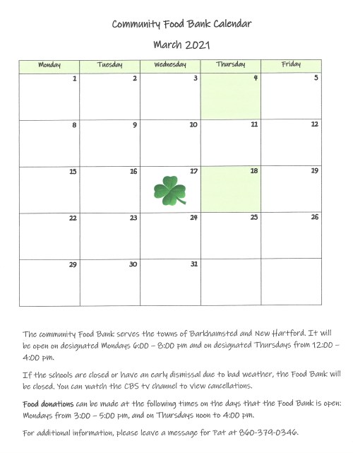 Shown below is the March 2021 calendar for the Community Food Bank, which is housed at the Pleasant Valley United Methodist. If you have any questions, or would like to make a donation, please call the phone number listed on the calendar and leave a message for Pat.