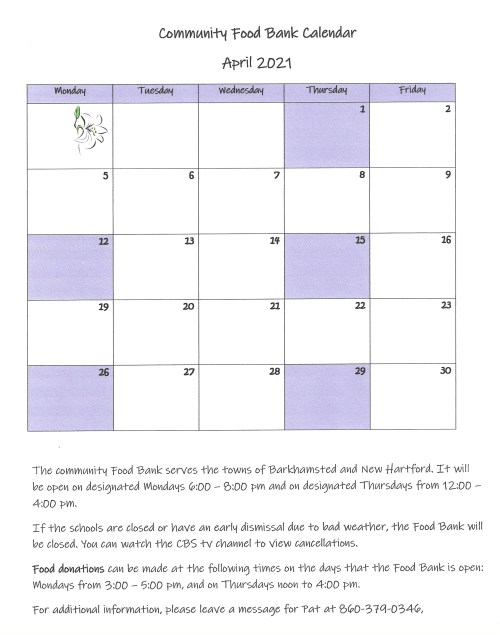 The Community Food Bank serves the towns of Barkhamsted and New Hartford. For additional information, call the phone number listed on the calendar page.