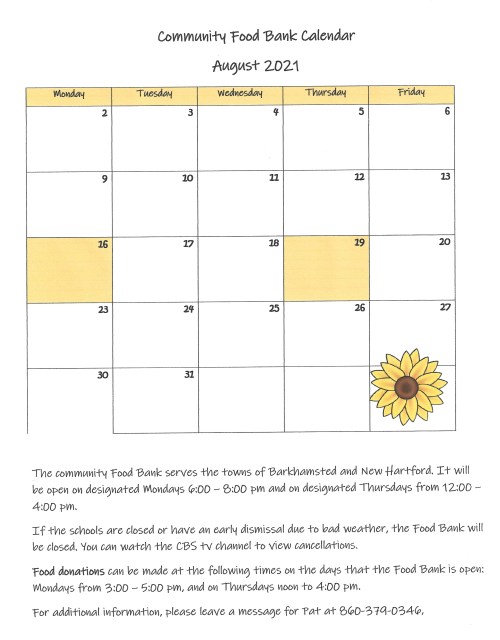 Below you’ll find the August calendar for the Community Food Bank, which serves the towns of Barkhamsted and New Hartford. Please notice that the food bank will only be open twice during the month of August. Regular hours will resume in September. Should you have any questions, please call the phone number listed on the calendar and leave a message for Pat.