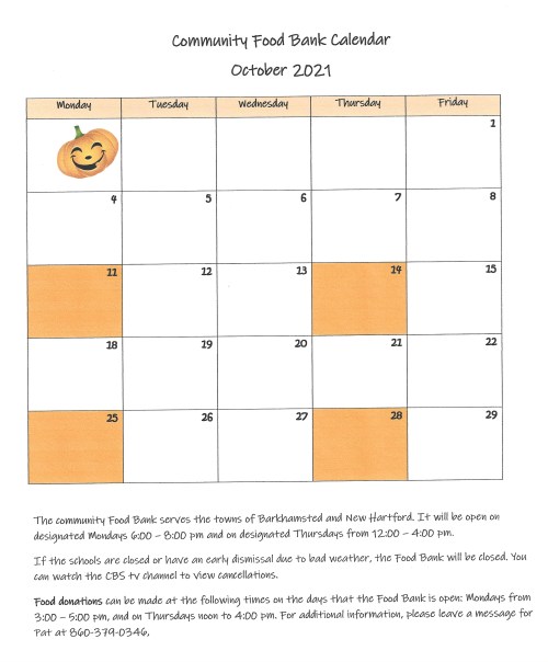 The Community Food Bank, housed at Pleasant Valley United Methodist Church, has published the October 2021 calendar, below. To view larger, simply click on the calendar.