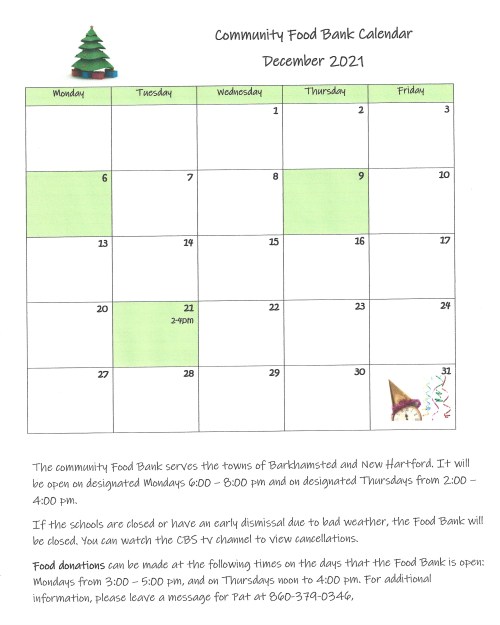 The calendar for the Community Food Bank is shown below. Please note the information below the calendar, in particular the information regarding closing due to bad weather. As a reminder, the Community Food Bank serves the towns of Barkhamsted and New Hartford. Currently, it is well stocked with items for your family so please stop in to meet with Pat.