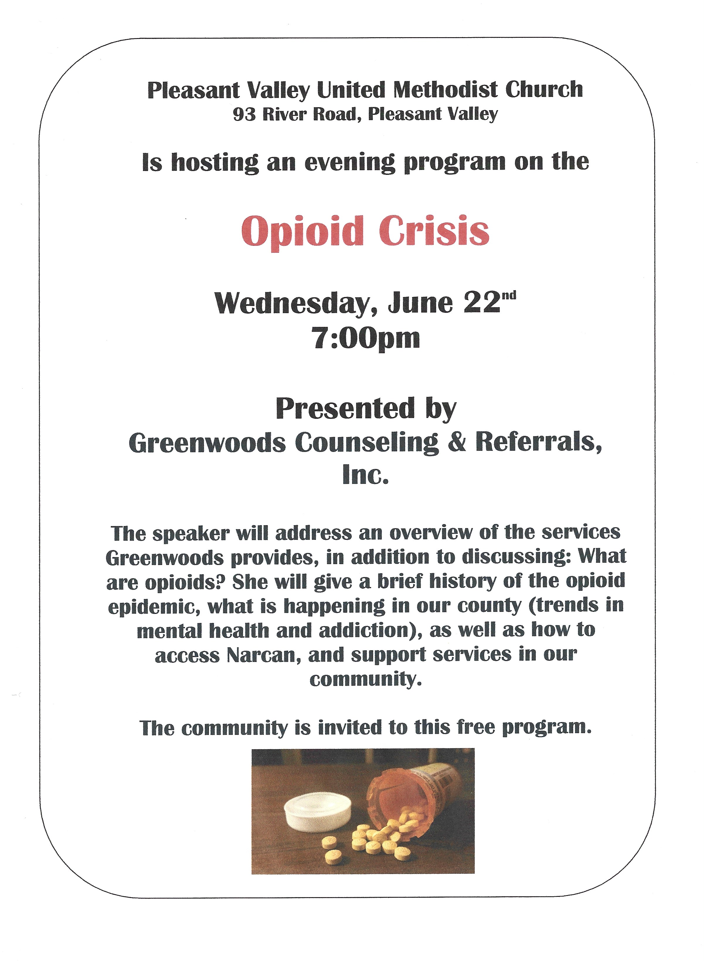 Our church will be presenting a program, hosted by Greenwoods Counseling & Referrals, Inc., on Wednesday, June 22nd at 7pm. They will address the opioid crisis in our country and local area, as well as share information to support our community. The program is free and open to the public. Additional information can be found on the flyer below.