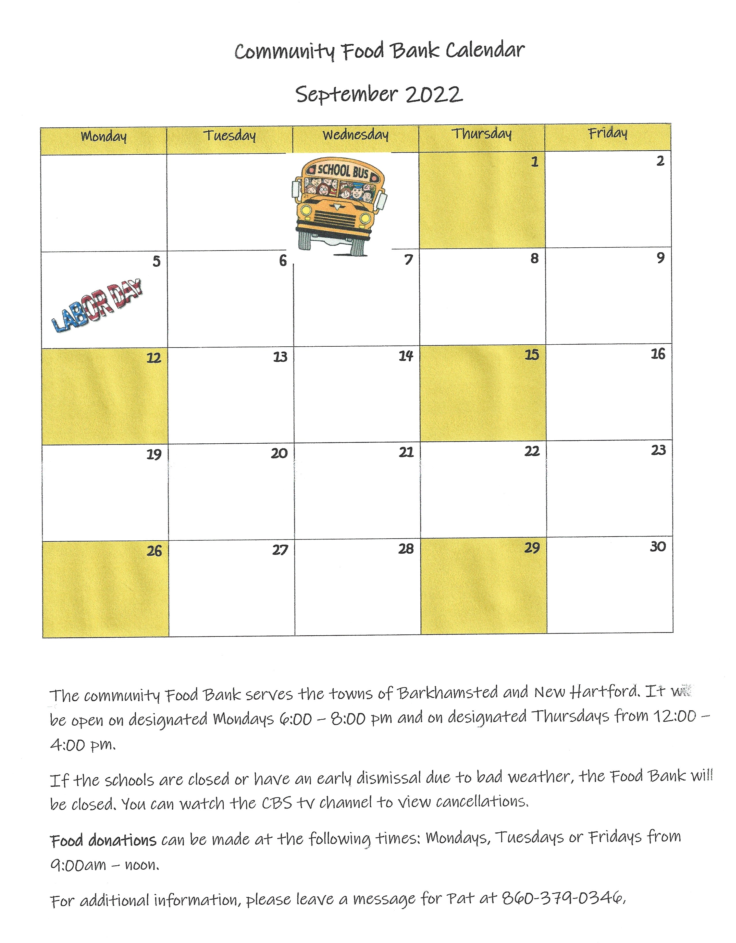Below is the September calendar for the Community Food Bank, housed at the Pleasant Valley United Methodist Church. The Food Bank serves the towns of Barkhamsted and New Hartford. See details at the bottom of the calendar.
