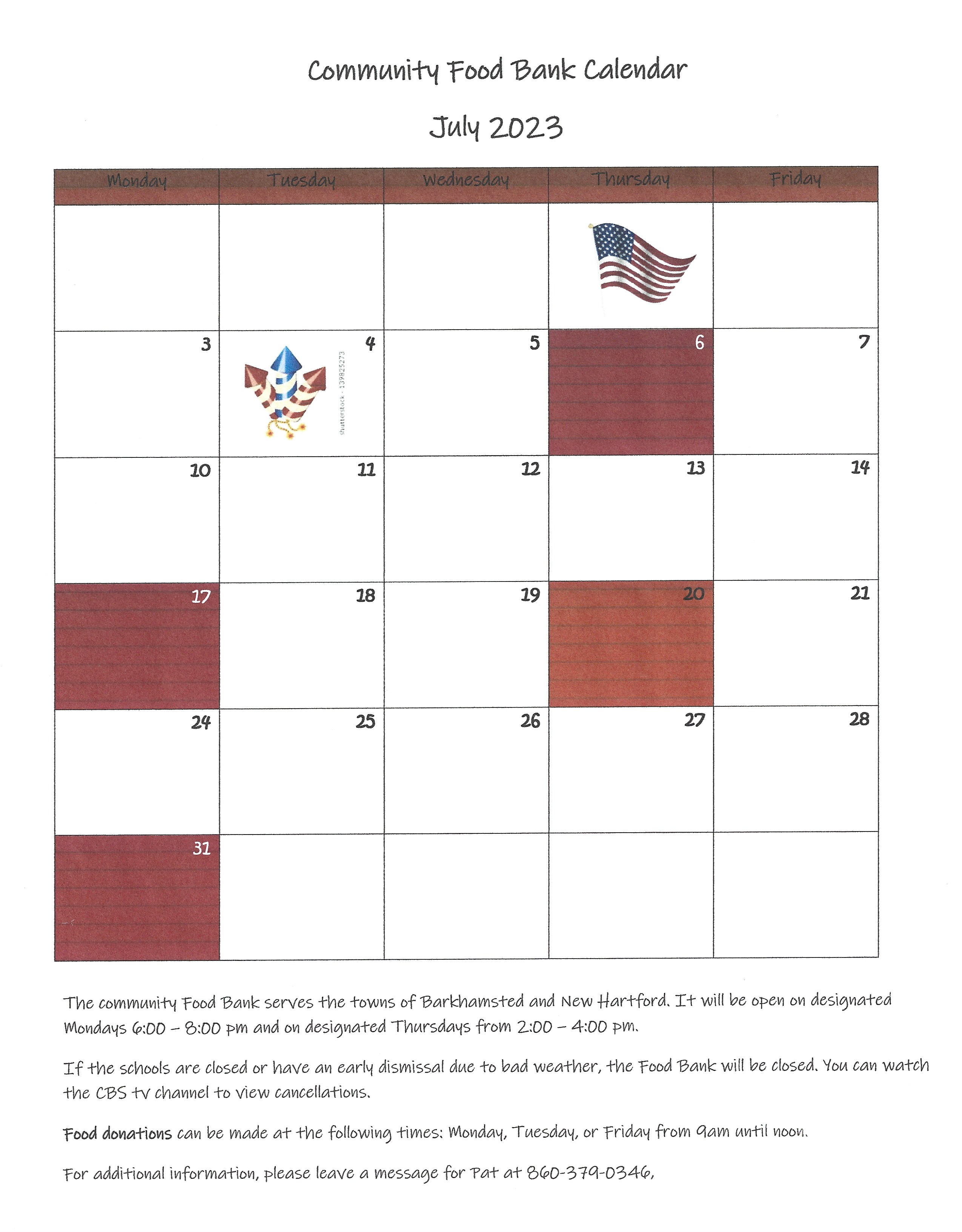 The July calendar for the Community Food Bank, housed at the Pleasant Valley/Winsted United Methodist Church, is shown below. For additional information, please call the phone number listed below the calendar.