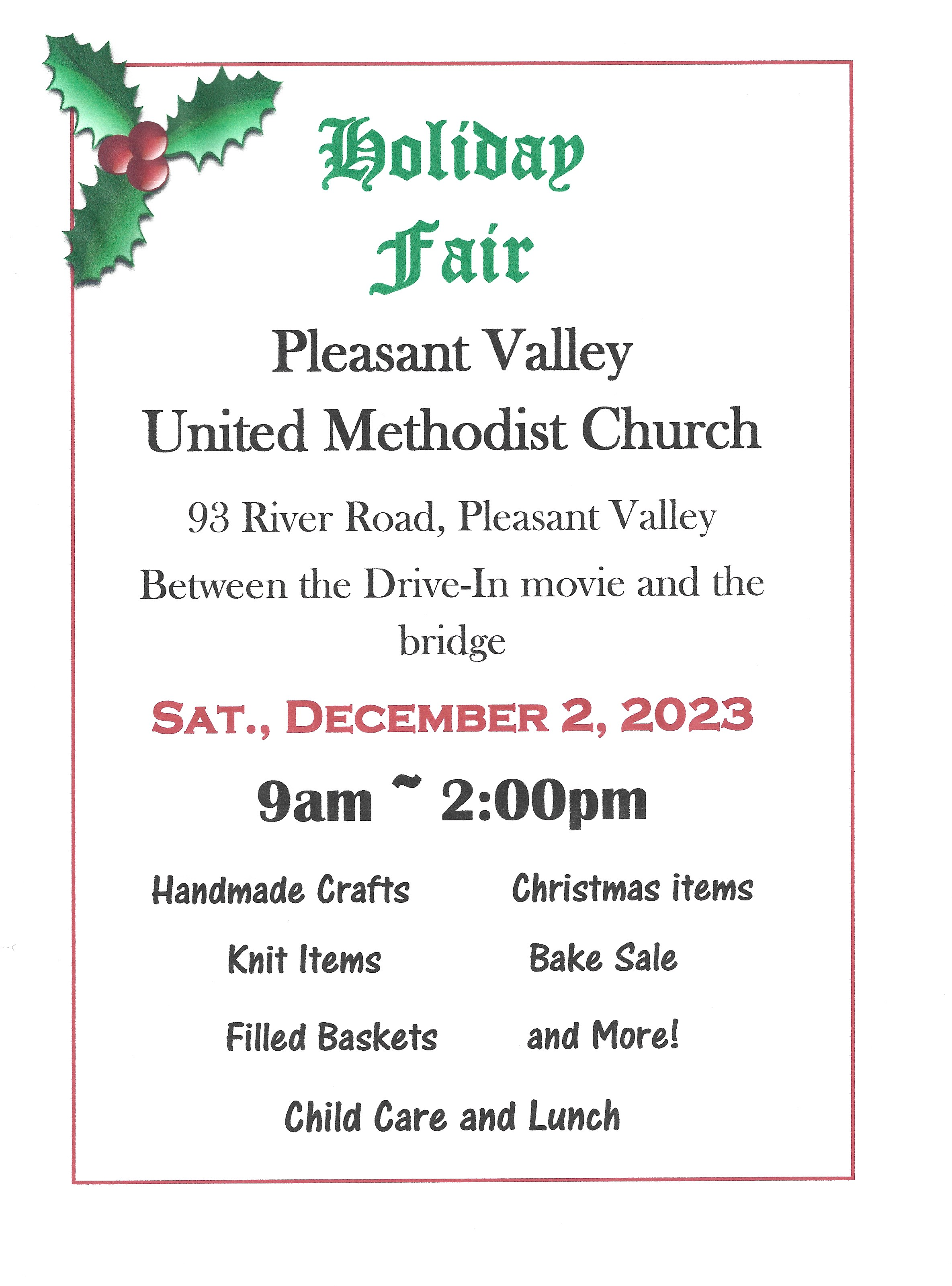 Our church will be hosting a holiday fair on Saturday, December 2nd and we hope you’ll mark your calendars and plan to join us for the fun! See the flyer below for details. We have lots of great items for you to view, a bake sale to wet your sweet tooth, and a lunch to give you strength to keep going! It will be a fun time so hope to see you there!