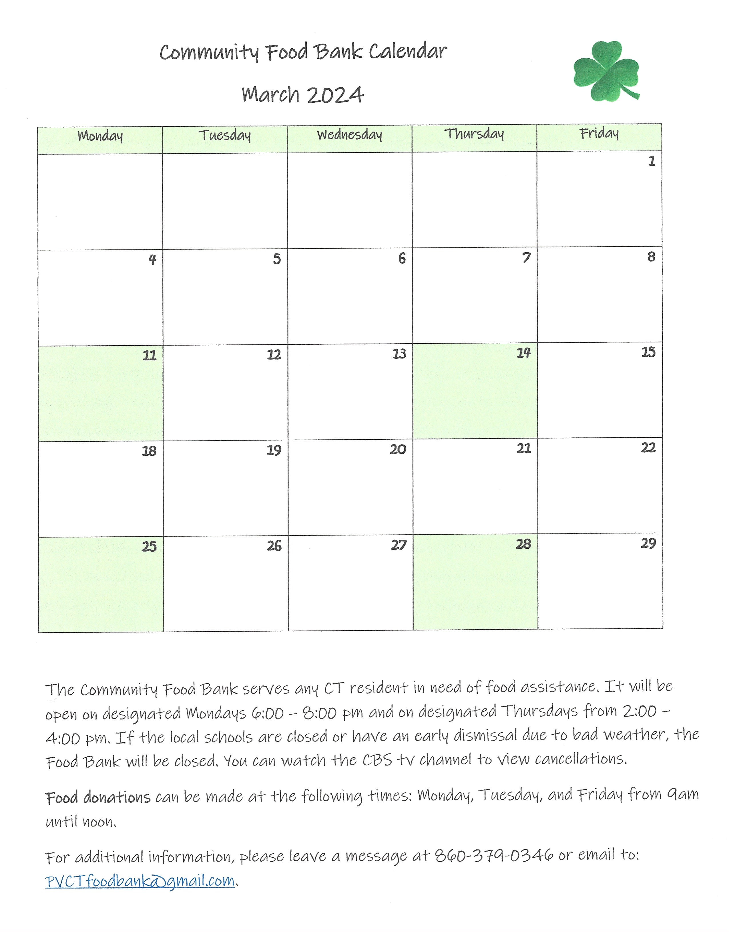 Shown below is the March calendar for the Community Food Bank, housed at the Pleasant Valley/Winsted United Methodist Church. For information, please call the phone number shown on the calendar or connect by email at the listed address.