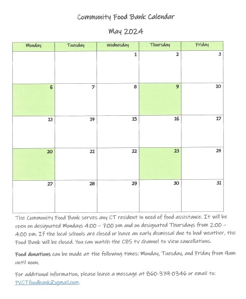 Shown below is the May calendar for the Community Food Bank, housed at the Pleasant Valley/Winsted United Methodist Church. As the note at the bottom states, the food bank is open to any Connecticut resident facing food insecurity. For additional information, see the note on the calendar.