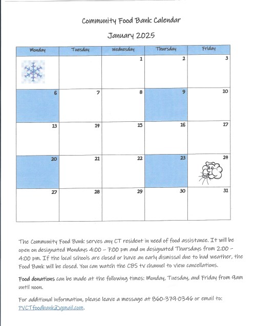 The January calendar for the Community Food Bank is shown below. Please note the hours and times the food bank will be open. As it states on the calendar, the food bank is open to any Connecticut resident in need of support.