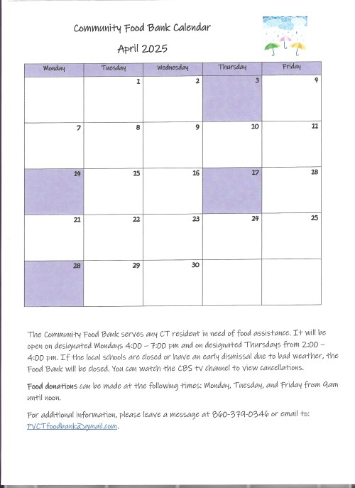 The April calendar for the Community Food Bank, housed at Pleasant Valley United Methodist Church, is shown below. Please note the days and times that the food bank is open. There is also listed a phone number and email address should you have questions. Also note the information regarding donations. The food bank is open to any Connecticut resident in need of food assistance.