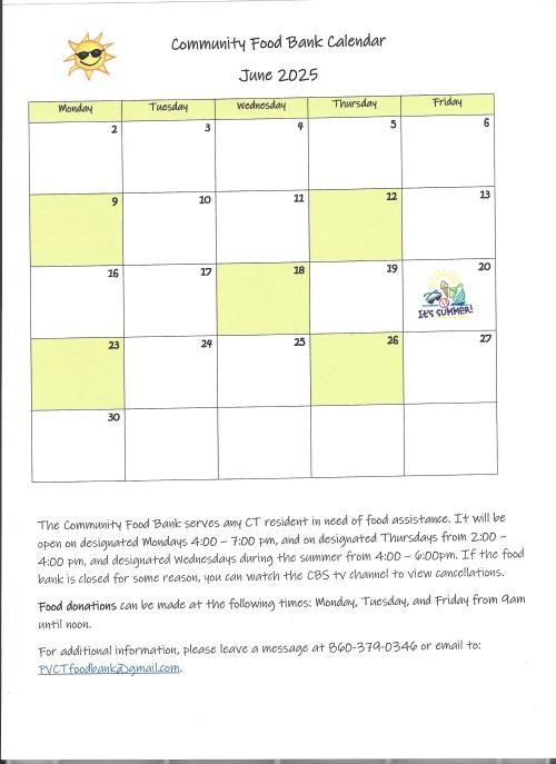 The June calendar for the Community Food Bank, housed at the Pleasant Valley United Methodist Church, is shown below. For additional information or to make a donation, please see the contact information listed below the calendar.