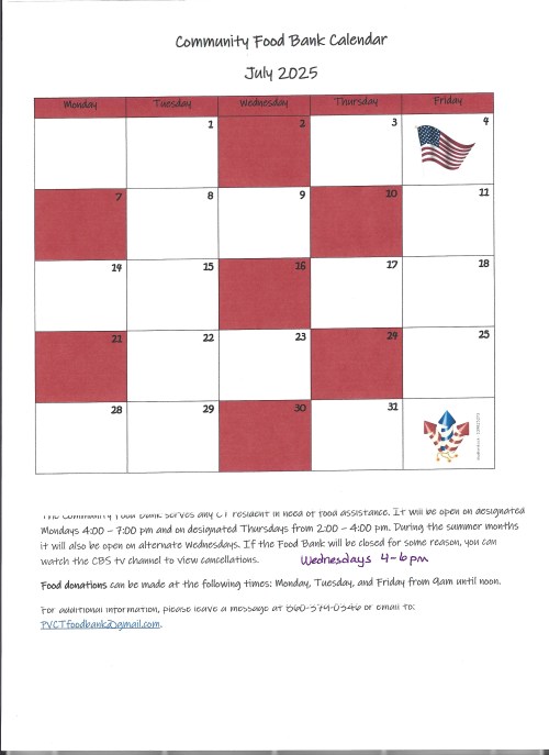 The July calendar for the Community Food Bank is shown below. Please note that during the summer months the food bank will be open on alternate Wednesdays from 4-6pm. Our hope is the garden on the side lawn of the church will have some fresh produce to bring to the food bank! Should you have any questions or concerns, please use the contact information listed below the calendar.
