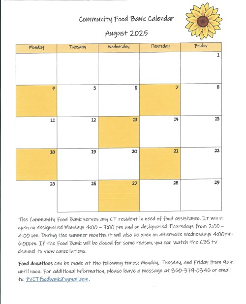 Community Food Bank Calendar: August August 2, 2025 ~ Margo F Shown below is the August calendar for the Community Food Bank, housed at Pleasant Valley United Methodist Church. Please note the information below the calendar for times, etc. Share this: Click to share on Facebook (Opens in new window) Facebook Click to share on X (Opens in new window) X Like Loading... Related Published by Margo F View all posts by Margo F