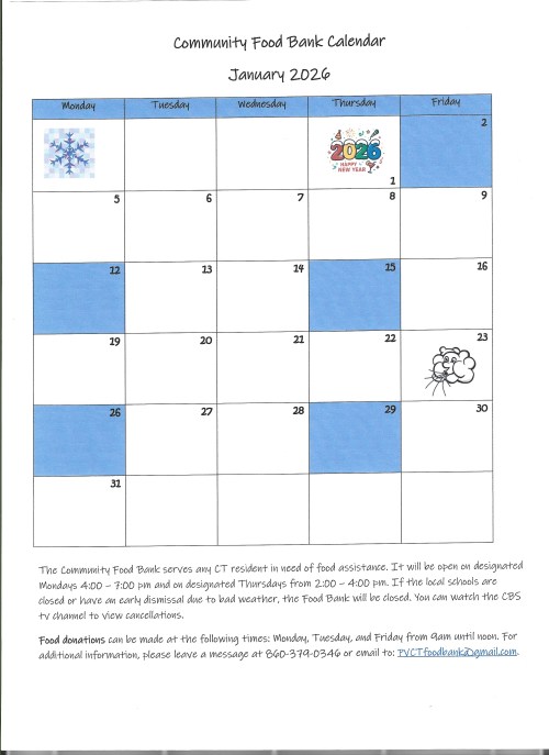 Shown below is the January calendar for the Community Food Bank. Please note that the normally scheduled opening of the food bank on January 1st will be moved to Friday, January 2nd from 2:00 – 4:00 pm. Please read the text below the calendar which will provide you information regarding weather related closings as well as ways to contact the food bank directly.
