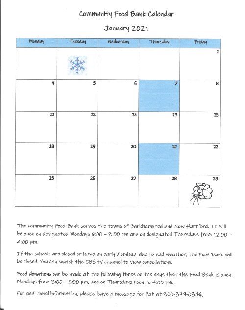 The December 2020 calendar for the Community Food Bank is shown below. To view it larger, simply click on it. The Community Food Bank serves the towns of Barkhamsted and New Hartford. Due to the covid-19 virus, orders are phoned in to the food bank staff who fill the order and bring it to a table outside the building for pick-up. If you want more information about the food bank, or to place an order, please call Pat at the number listed on the calendar.