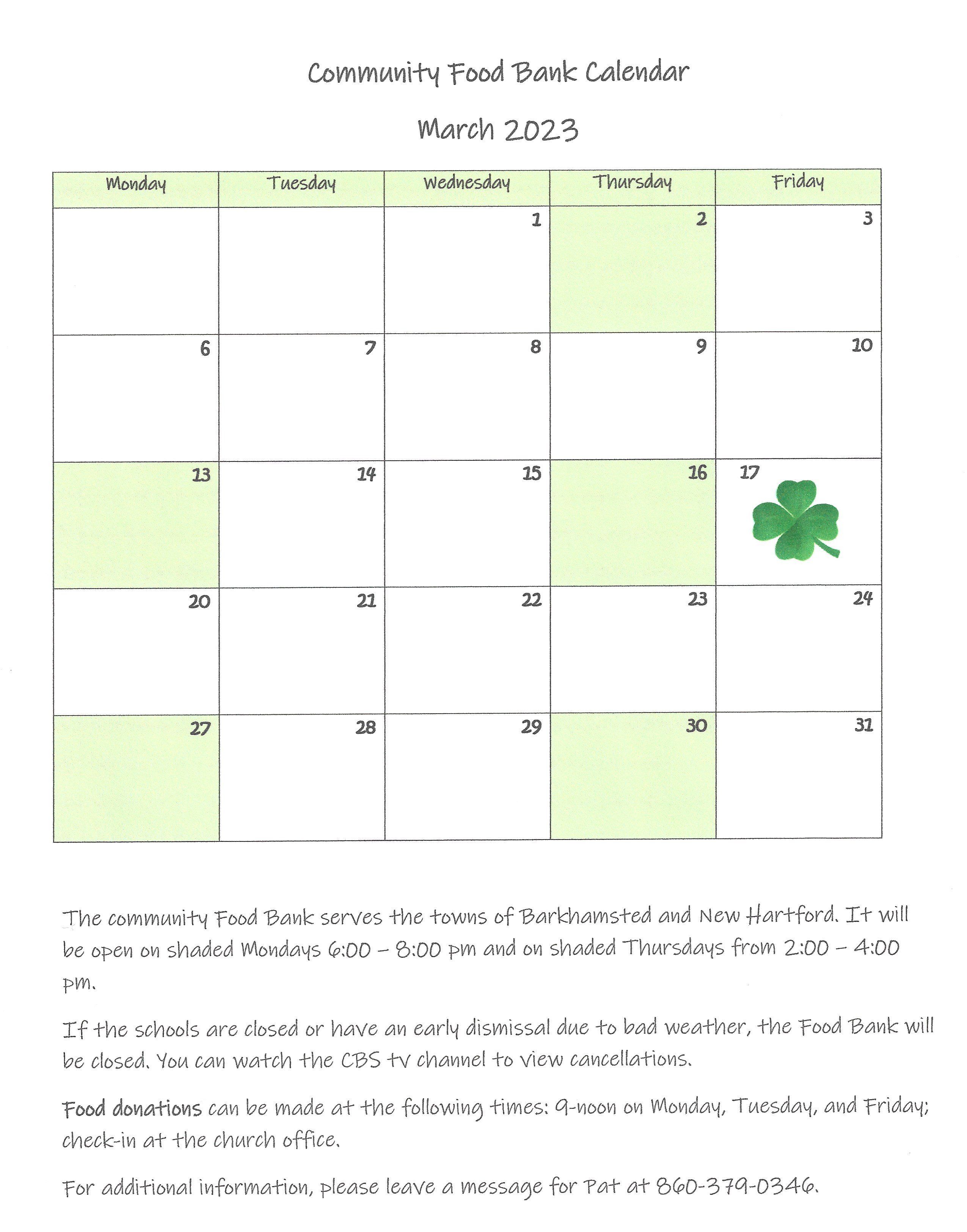 The March calendar for the Community Food Bank is shown below. To view larger, simply click on the calendar.